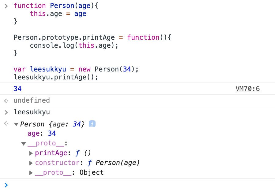 이제 Person이라는 생성자 함수를 통해 만들어진 모든 인스턴스들은 printAge 함수를 공통으로 이용할 수 있게 되었다.